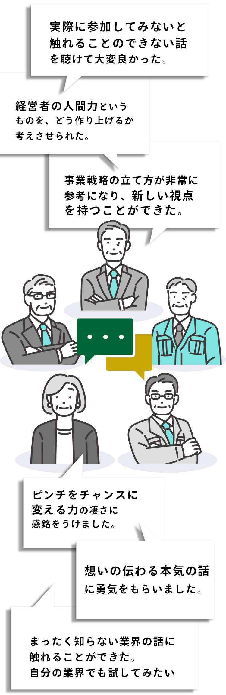 MARKファミリービジネス研究会は、経営に情熱を傾け、悩む経営者仲間が集います。受講メンバーや講師企業とのつながりがビジネスにつながった事例も多くあります。