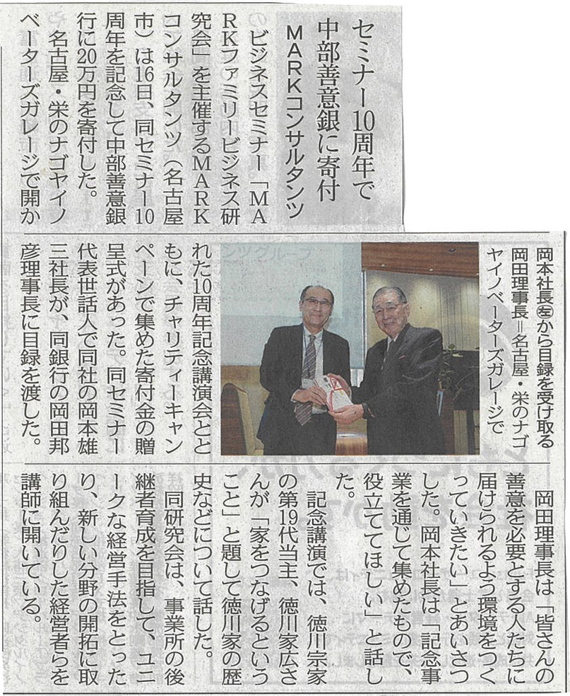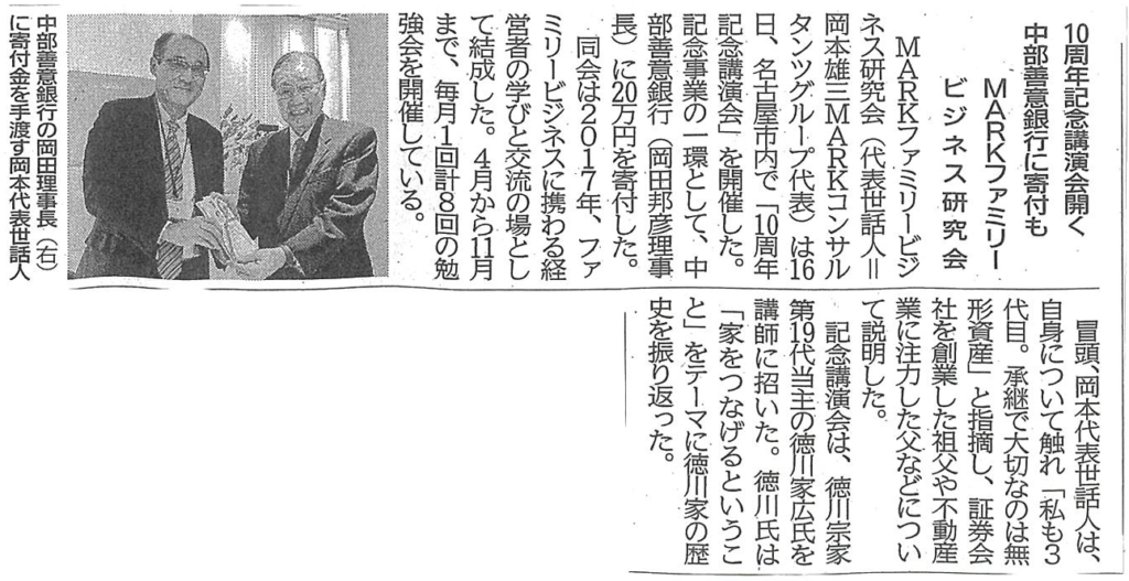 贈呈式は10周年記念特別講演会(講師:徳川宗家19代当主・徳川家広氏)の中で行われ、その記事が中日新聞と中部経済新聞に掲載されました。